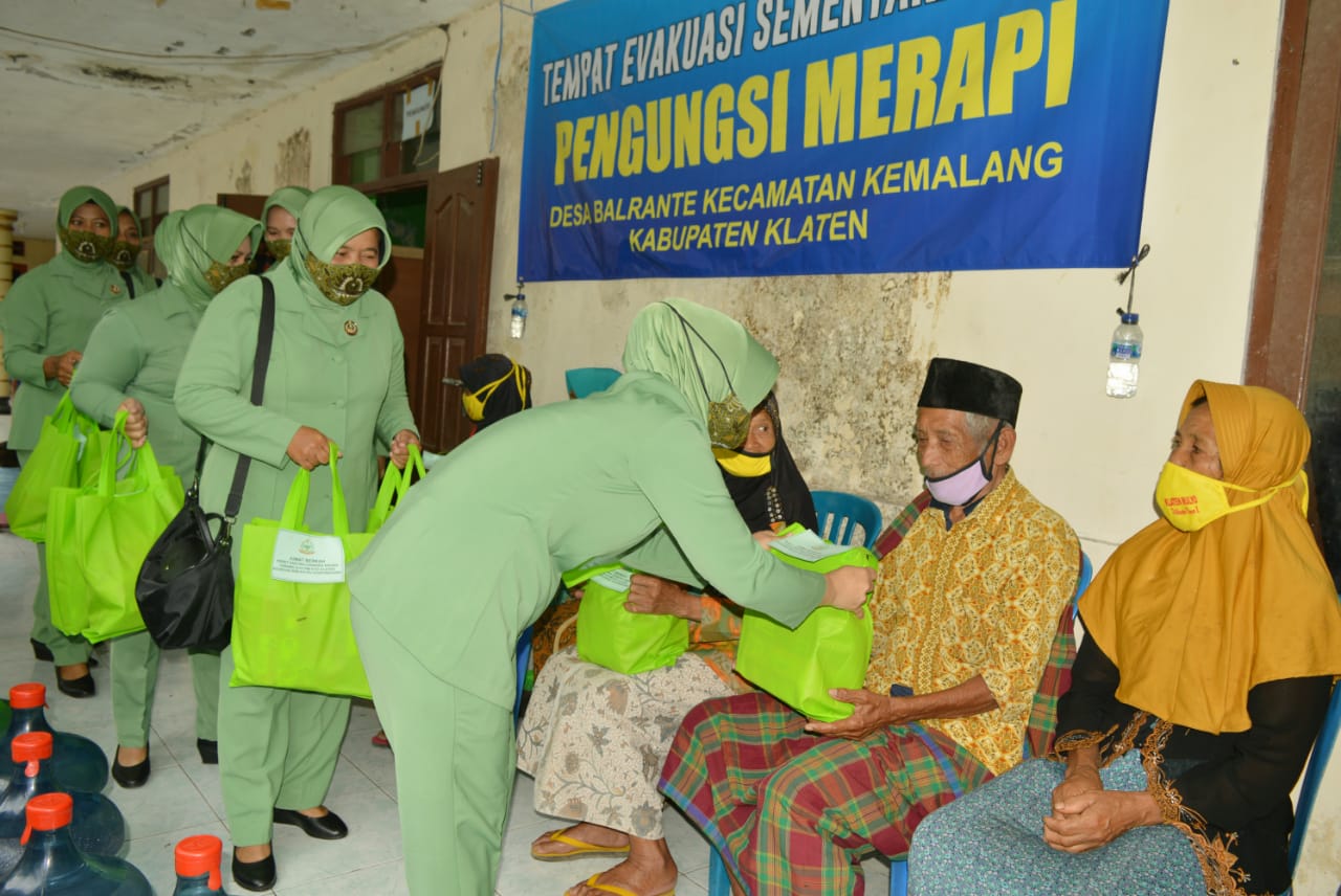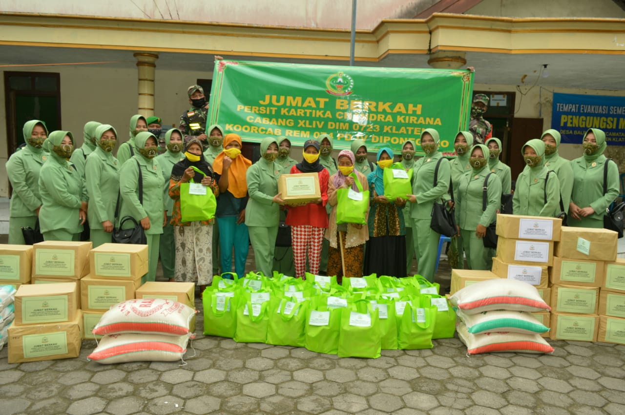Persit Kartika Chandra Kirana Cabang XLIV Dim 0723 Koorcab Rem 074 PD IV/Diponegoro melaksanakan Jumat Berkah dengan berbagi sembako kepada pengungsi Gunung Merapi di Kantor Desa Balerante Kecamatan Kemalang Kabupaten Klaten. Jumat (27/11/2020).