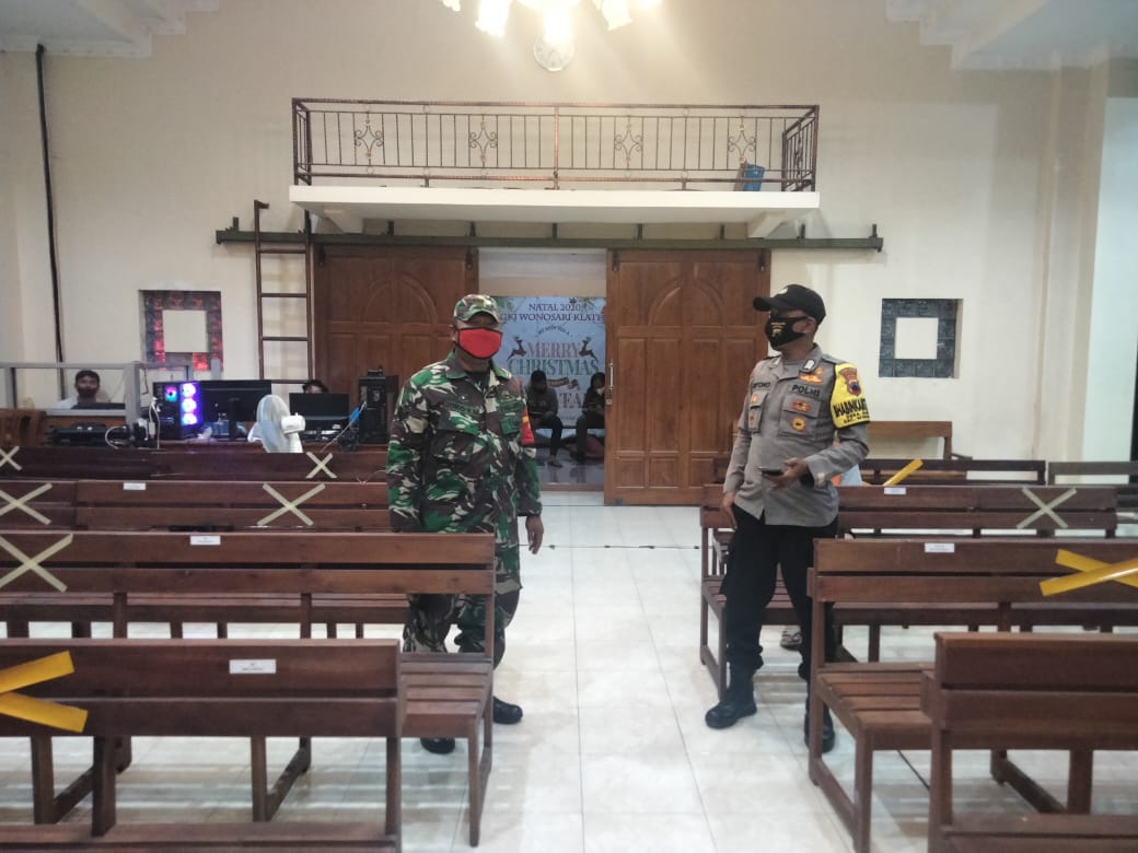 Klaten –  Serka Joko Sri Murningsih Babinsa Desa Duwet Koramil 22 Wonosari Kodim 0723 Klaten Bersama Bripka Lestariyono Babhinkamtibmas Polsek Wonosari melaksanakan pengamanan perayaan Natal secara Virtual  di Gereja Kristen Jawa di Dukuh Poko RT 1 RW 4 Desa Duwet Kecamatan Wonosari Kabupaten Klaten.(25/12/2020)