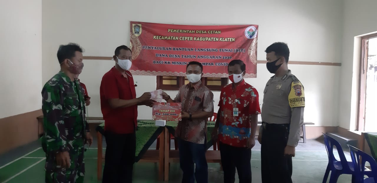Klaten – Bantuan pemerintah untuk warga masyarakat yang hidup dibawah garis kemiskinan masih terus dikucurkan. Kali ini 124 orang warga miskin Desa Cetan yang terback up bantuan BLT DD bisa tersenyum lega, pasalnya Bantuan Langsung Tunai (BLT) DD Tahap VIII dan IX sudah diterimakan kepada mereka yang berhak. Selasa (29/12/20)