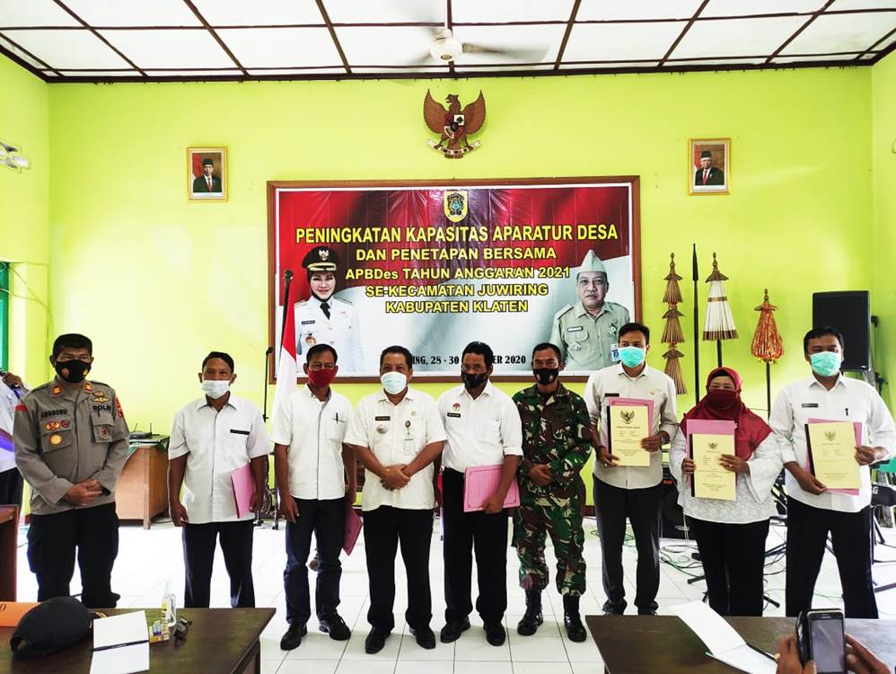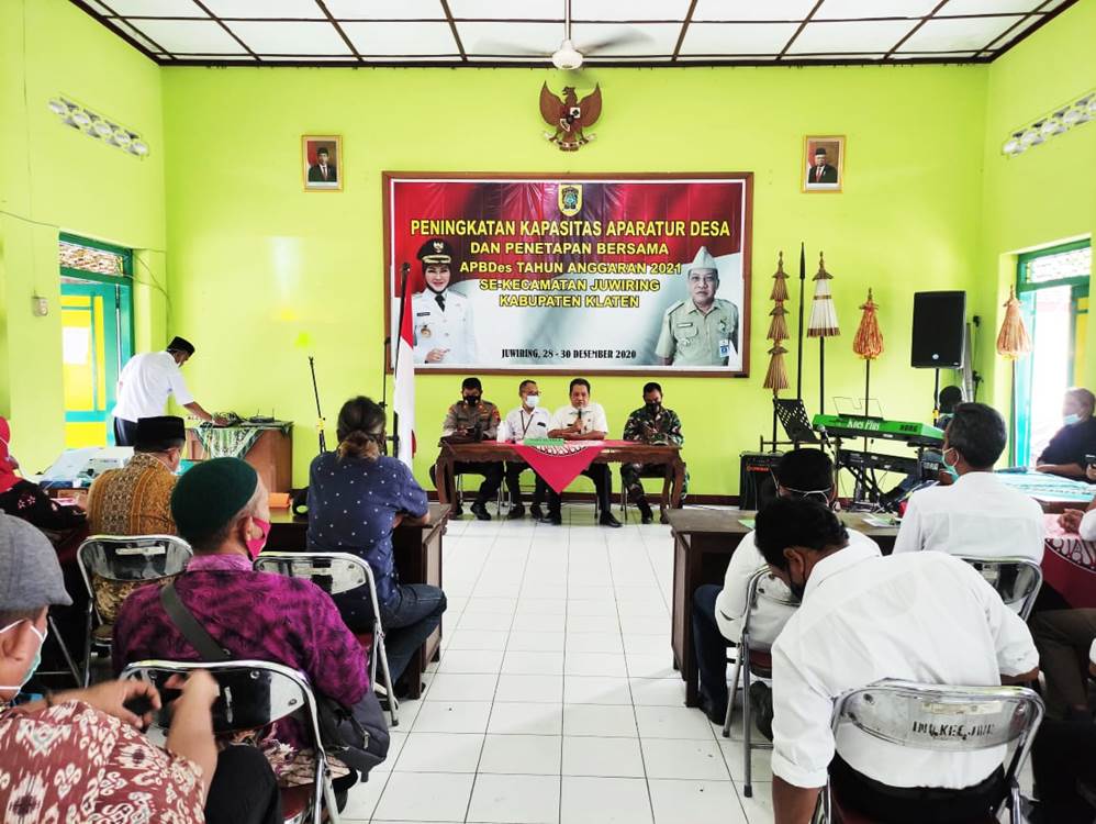 Penetapan  bersama Anggaran Pendapatan dan Belanja Desa (APBDes) Tahun Anggaran 2021 desa se Kecamatan Juwiring dihadiri oleh Danramil 21/Juwiring Kodim 0723/Klaten yang diwakili  Bati Tuud Pelda Suyono bersama Forkopimcam di Aula Kantor Kecamatan Juwiring, Kabupaten Klaten, Rabu (30/12/20).