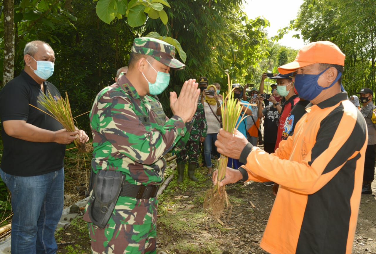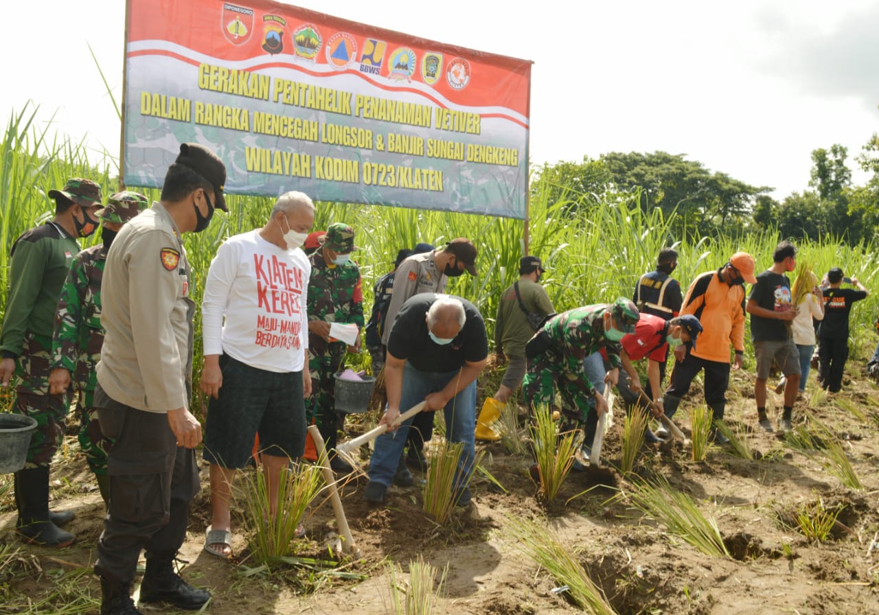 Klaten– Kodim 0723 Klaten bersama dengan BNPB dan relawan melaksanakan penanaman vetiver guna mencegah terjadinya longsor dan banjir bantaran sungai Dengkeng di Desa Beluk dan Desa Kebon Kecamatan Bayat Kabupaten Klaten. Sabtu (19/12/20)