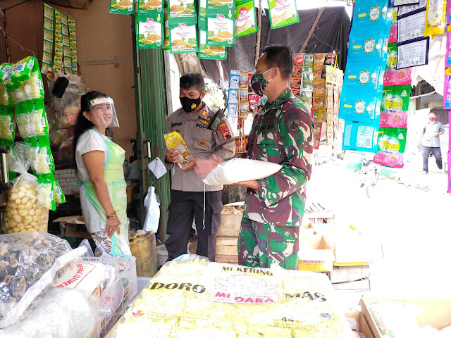 Danramil 21/Juwiring Kodim 0723/Klaten Kapten Cba Maliana Heri Sugiarto bersama Muspika Kecamatan Juwiring mengecek sejumlah kebutuhan bahan pokok menjelang Hari Raya Natal dan tahun baru di Pasar Panjangan Desa Gondangsari, Kecamatan Juwiring, Kab. Klaten, Kamis (17/12/2020).