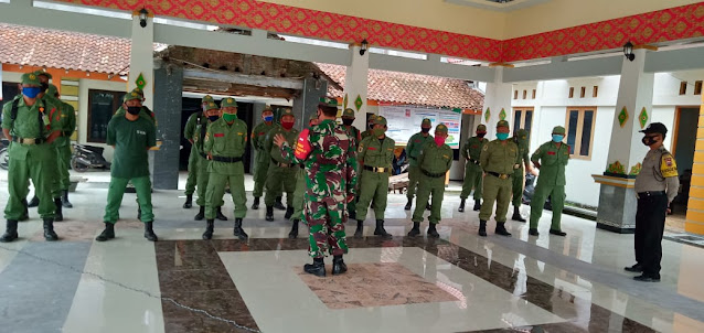 Babinsa Koramil 23/Ceper Kodim 0723/Klaten Serka Gunanto bersama Bhabinkamtibmas Polsek Ceper memberikan pembekalan dan pembinaan terhadap Linmas Desa Dlimas. Pembinaan dilakukan di aula kantor Balai Desa Dlimas, Senin (07/12/2020).