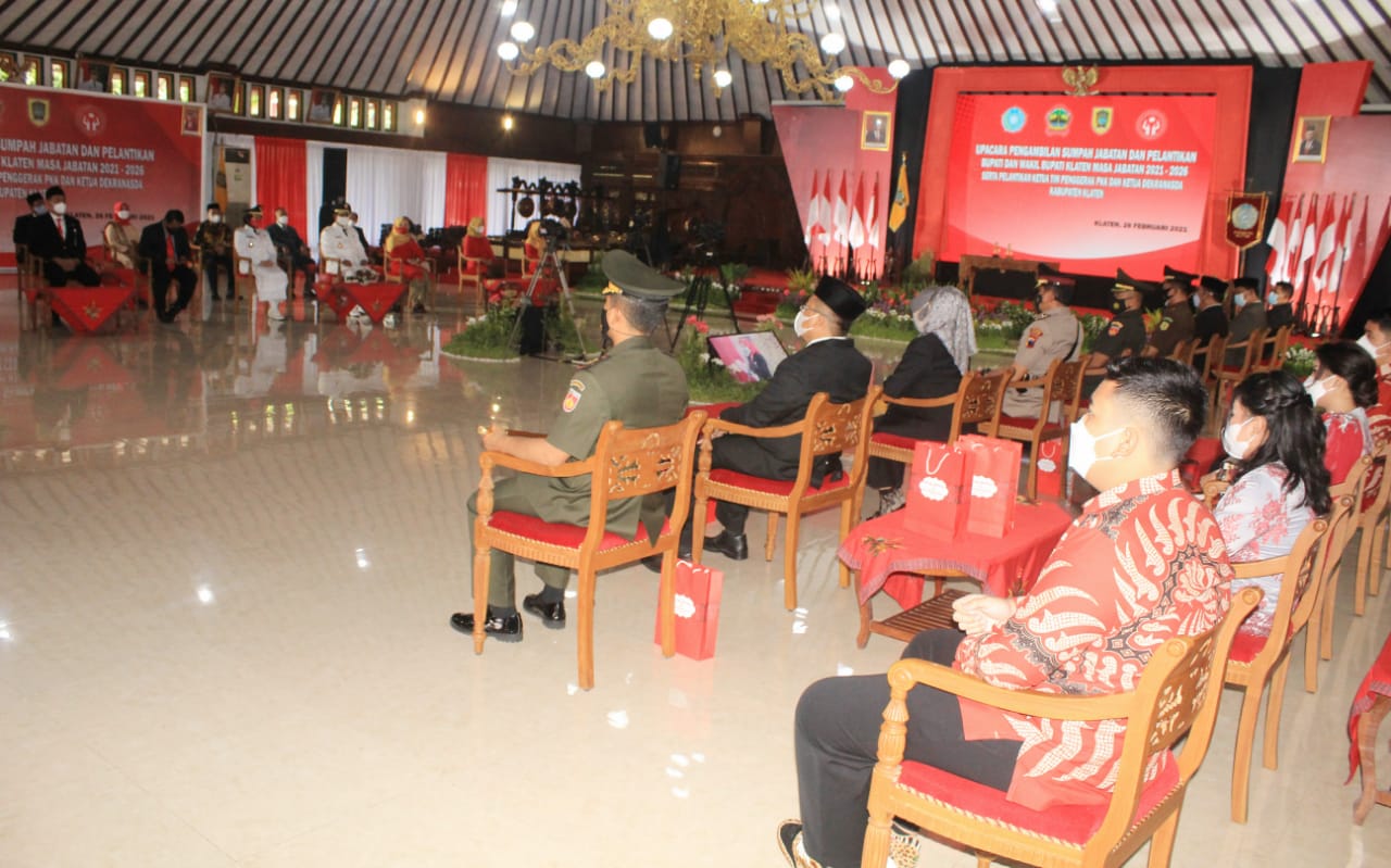 Saat pelantikan tersebut Dandim juga memberikan ucapan selamat kepada Hj Sri Mulyani dan H Yoga Hardaya sebagai Bupati dan Wakil Bupati Klaten Periode 2021 – 2026.