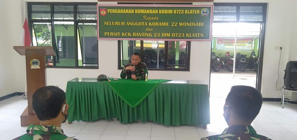 Klaten – Letnan Kolonel Inf Joni Eko Prasetyo Sip Dandim 0723 Klaten memberikan pengarahan kepada anggota Koramil 22 Wonosari pengarahan di gelar di Aula Makoramil 22 Wonosari Klaten,(9/3/2021)