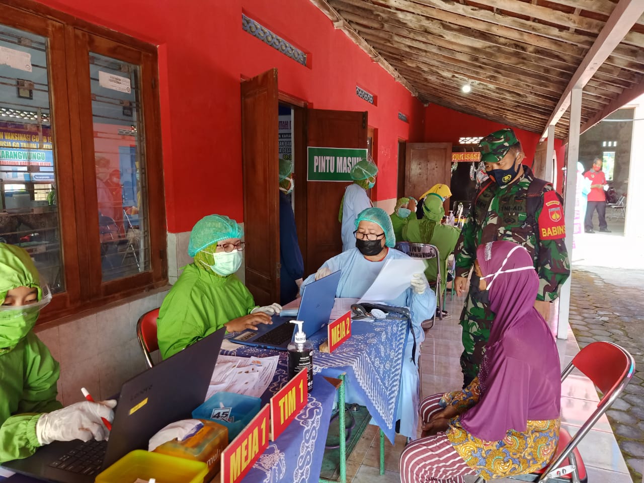 Klaten – Serka Yudi Waluyo Babinsa karangwungu,Anggota Koramil 17/Karangdowo ,Kodim 0723/Klaten bersama Kepala Puskesmas Dr.Fitria,kasitrantib,kepala desa karangwungu Melaksanakan pendampingan dan pemantauan vaksinasi Lansia di balai desa karangwungu. (13/03/2021).