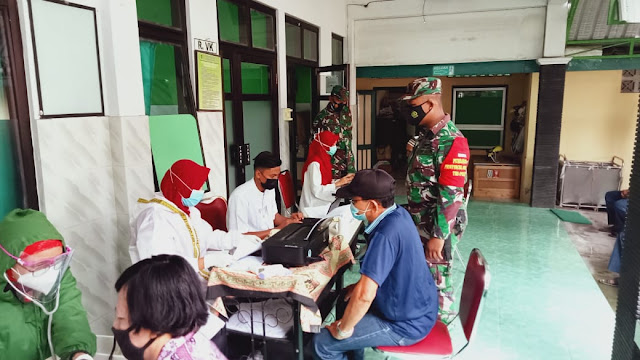 Klaten | Pelda Ramli Batituud Koramil 22 Wonosari Kodim 0723 Klaten dan Bhabinkamtibmas Polsek Wonosari melaksanakan kegiatan monitoring pengamanan Penyuntikan vaksin Covid-19 kepada warga masyarakat khususnya Lansia bertempat di Puskesmas I Wonosari di Desa Bentangan Kecamatan Wonosari Kabupaten Klaten, Rabu (10/3/2021)