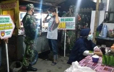 Lebih lanjut Pelda Wiradi selaku Babinsa Desa Bulan menjelaskan kegiatan Gakplin Protokol Kesehatan di tempat keramaian seperti diwarung makan untuk menghimbau warga agar selalu patuhi 5 M diantaranya jaga jarak dan memakai masker,dan selalu mencuci tangan , Menghindari kerumunan dan mengurangi Aktivitas,