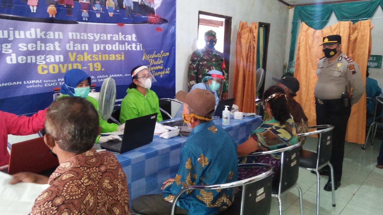 Klaten – Bintara Pembina Desa (Babinsa) Koramil 11/Karangnongko Kodim 0723/Klaten Sertu Fajar Syafruddin   bersama Anggota Polsek Karangnongko  melaksanakan pengamanan dan pemantauan kegiatan  Vaksin Tahap 1  Covid 19.