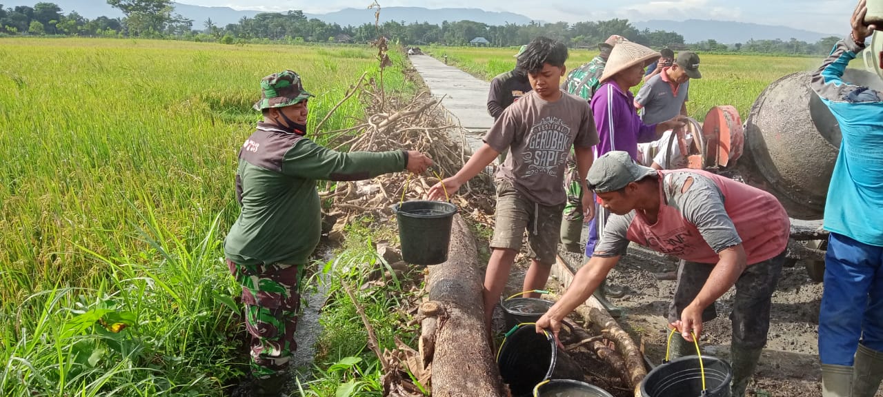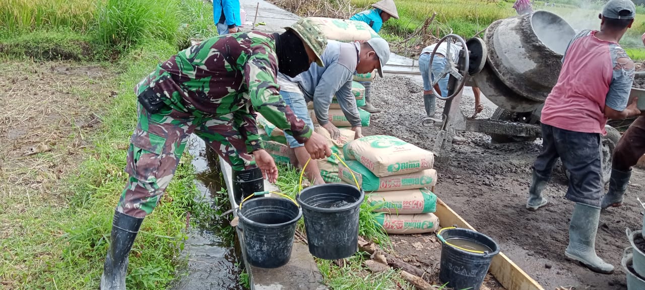 Klaten – Koramil 02/Jogonalan Kodim 0723 Klaten bersama masyarakat melaksanakan karya bakti pengecoran jalan usaha tani didesa Tambakan, kecamatan Jogonalan, kabupaten Klaten. (09/03/2021)