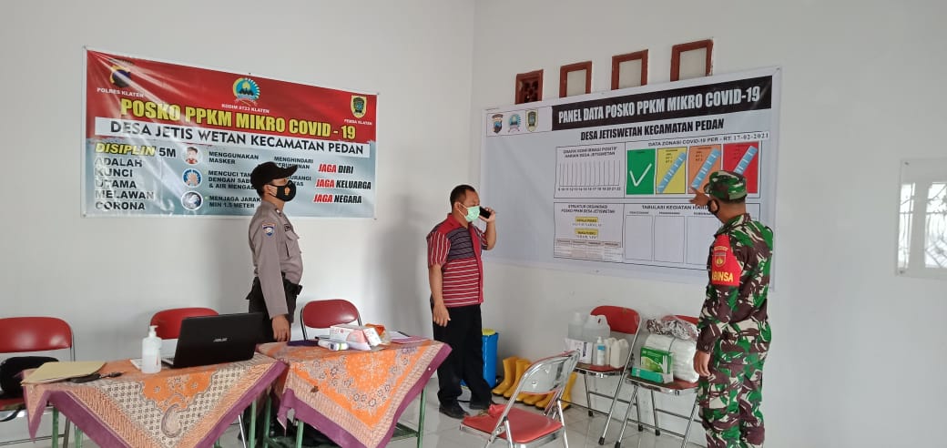 Seperti yang dilakukan Babinsa Desa Jetiswetan Serda Joko Purnomo bersama Bhabinkamtibmas Desa Jetiswetan melaksanakan monitoring Pos PPKM Mikro di Desa Jetiswetan Kecamatan Pedan Kabupaten Klaten. (05/03/2021)