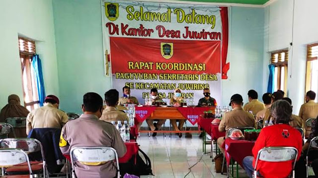 Dalam sambutan Camat Juwiring yang disampaikan Kasi Pemerintahan menyampaikan bahwa Rapat Koordinasi Sekdes merupakan agenda rutin Kec. Juwiring sebagai forum sharing antar desa untuk membahas pelaksanaan berbagai program pembangunan yang sedang berjalan di desa, menggali permasalahan dan mencari solusi pemecahannya.