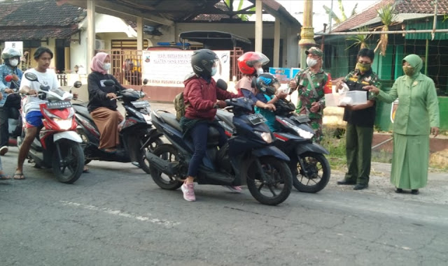 embagian takjil ini juga dibarengi dengan edukasi dan himbauan tentang protokol kesehatan Kepada Setiap warga yang melintas di depan makoramil 07/Wedi Dukuh Kuntulan Desa Gadungan Kecamatan Wedi kabupaten Klaten.