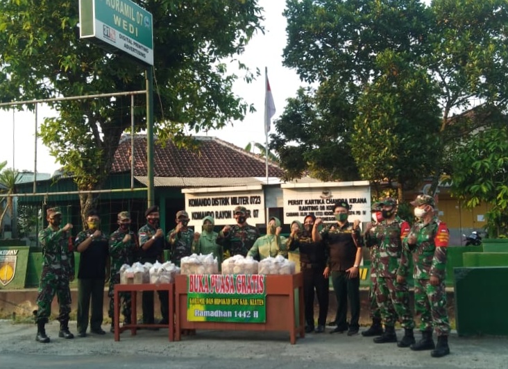 Klaten – Menjelang Waktu Berbuka Puasa di Bulan Ramadhan.Koramil 07/Wedi Kodim 0723/Klaten Bersama Anggota Himpunan Putra Putri Keluarga Angkatan Darat (HIPAKAD) Berbagi Takjil Sebanyak 200 Nasi Bungkus kepada warga yang melintas di depan Makoramil 07/Wedi.