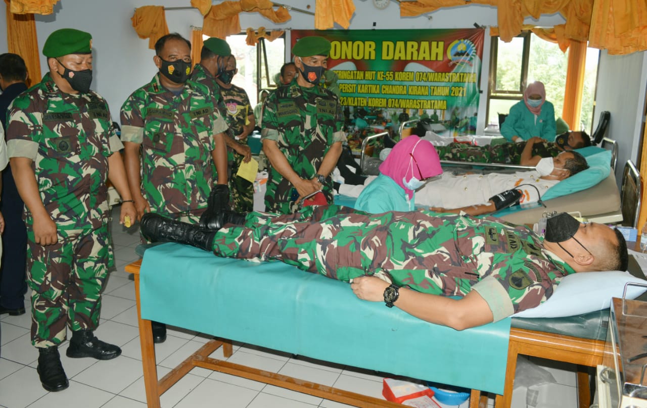 Klaten – Dalam rangka memperingati HUT ke 55 Korem 074 Warastratama dan HUT ke 75 Persit Kartika Chandra Kirana Kodim 0723 Klaten menggelar Baksos Donor Darah di Aula Kantor PMI Kabupaten Klaten. Selasa (06/04/21)