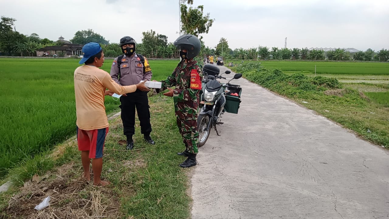 Klaten – Di bulan suci Ramadhan yang penuh berkah ini, Serma Suroto Babinsa Koramil 04/Pedan Kodim 0723/Klaten bersama dengan Bripka Gunawan Bhabinkamtibmas Polsek Pedan melaksanakan kegiatan bagi-bagi takjil dan masker kepada warga masyarakat binaanya di Desa Tambakboyo Kecamatan Pedan Kabupaten Klaten. Selasa ( 11/05/2021 )