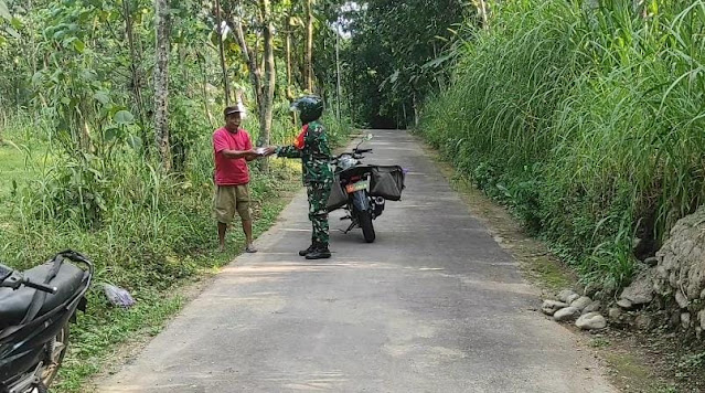 Klaten | Babinsa Koramil 08 Ngawen Kodim 0723 Klaten Serda Agus Rohmadi membagikan takjil dan masker untuk warga binaannya di Desa Pepe Kecamatan Ngawen Kabupaten Klaten, Rabu (05/05/2021).