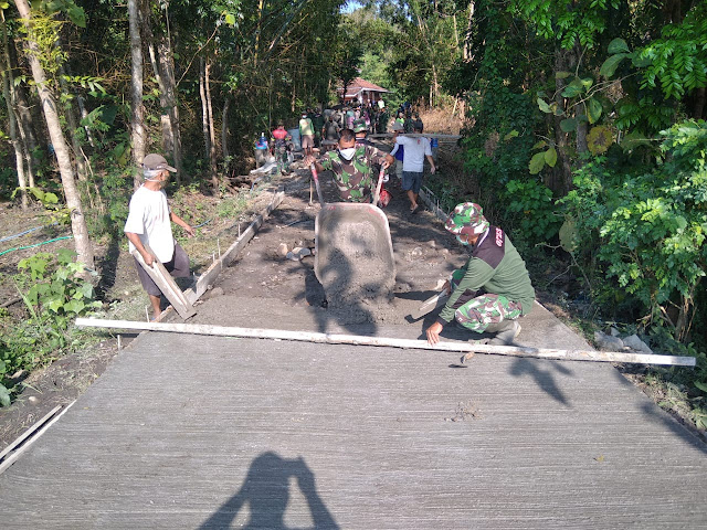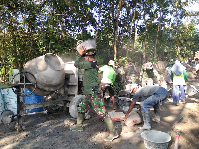 Warga Desa Krakitan bersama Kodim 0723 Kpaten bergotong royong untuk menyelesaikan betonisasi jalan sepanjang 710 meter, lebar 3 meter dan tebal 15 cm.