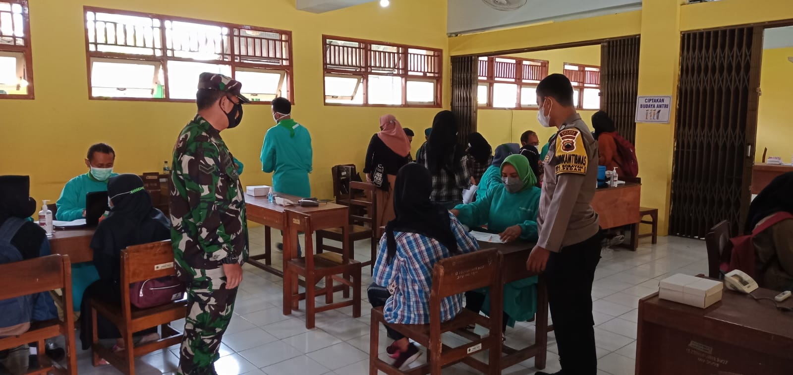 Pada kesempatan tersebut Babinsa dan Bhabinkamtibmas mengecek langsung pelaksanaan pemberian Imunisasi Vaksin Covid-19 Tahap I kepada 1067 orang Siswa – Siswi SMK Negeri 1 Pedan.