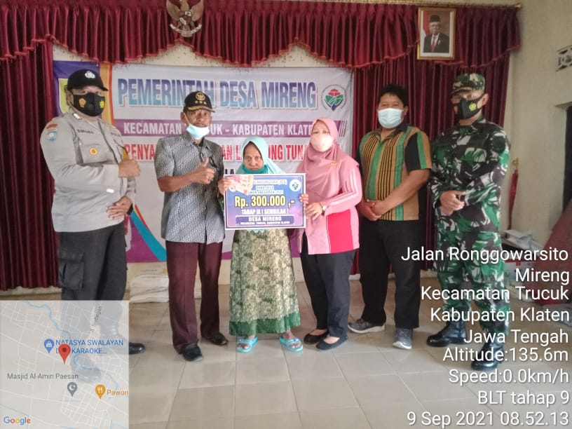 Klaten – Serda Suranto Babinsa Desa Mireng Koramil 19 Trucuk Kodim 0723 Klaten melaksanakan Pengawalan dan Pendampingan Penyaluran Bantuan Langsung Tunai (BLT) Dana Desa kepada warga yang kurang mampu di Desa Mireng Kecamatan Trucuk Kabupaten Klaten.Kamis (09/09/2021).