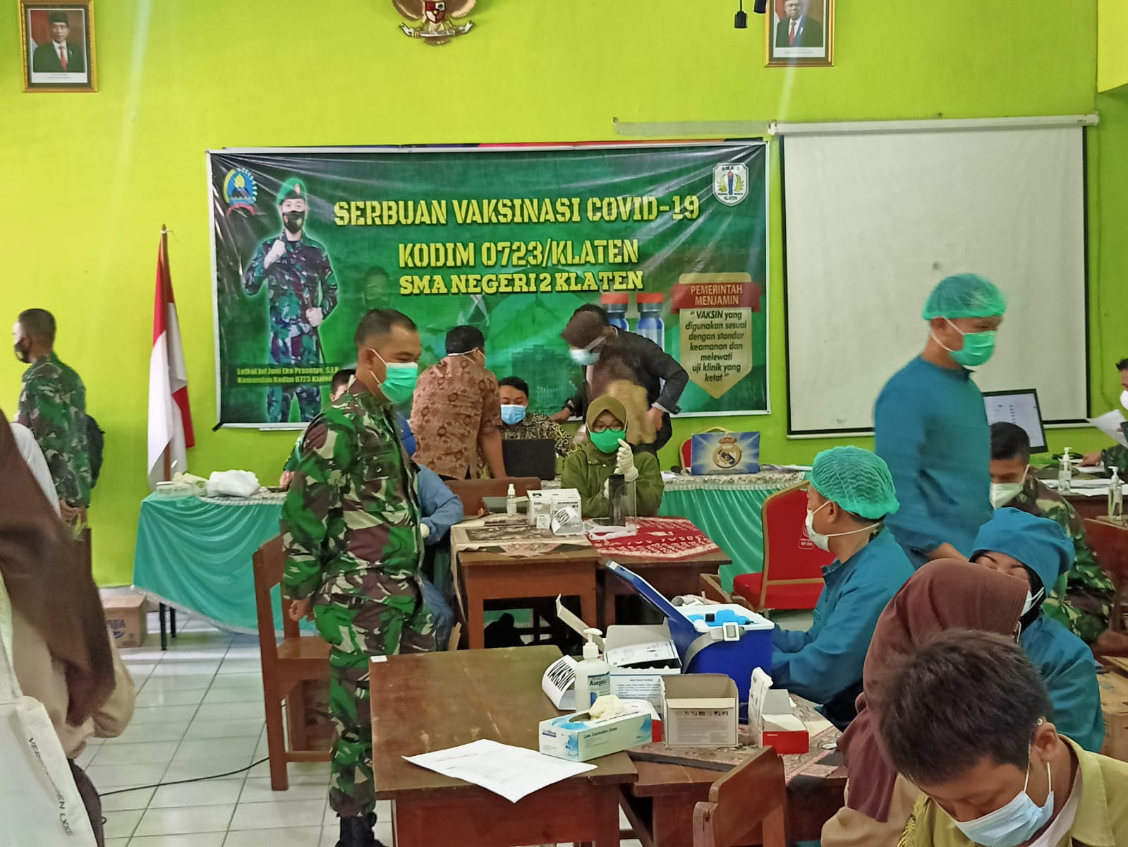 Serbuan vaksin Kodim 0723/Klaten di SMA N2 Klaten dalam rangka mendukung program pemerintah tentang vaksinasi covid -19 dalam rangka mendukung ketertiban dan kelancaran kegiatan vaksin tersebut maka, Koramil 06/Kebonarum Kodim 0723/Klaten menurunkan Babinsa agar bersinergi dengan unsur Tiga Pilar lainnya mendukung pelaksanaan vaksinasi, lancar dan tertib standar protokol kesehatan yang ditetapkan.