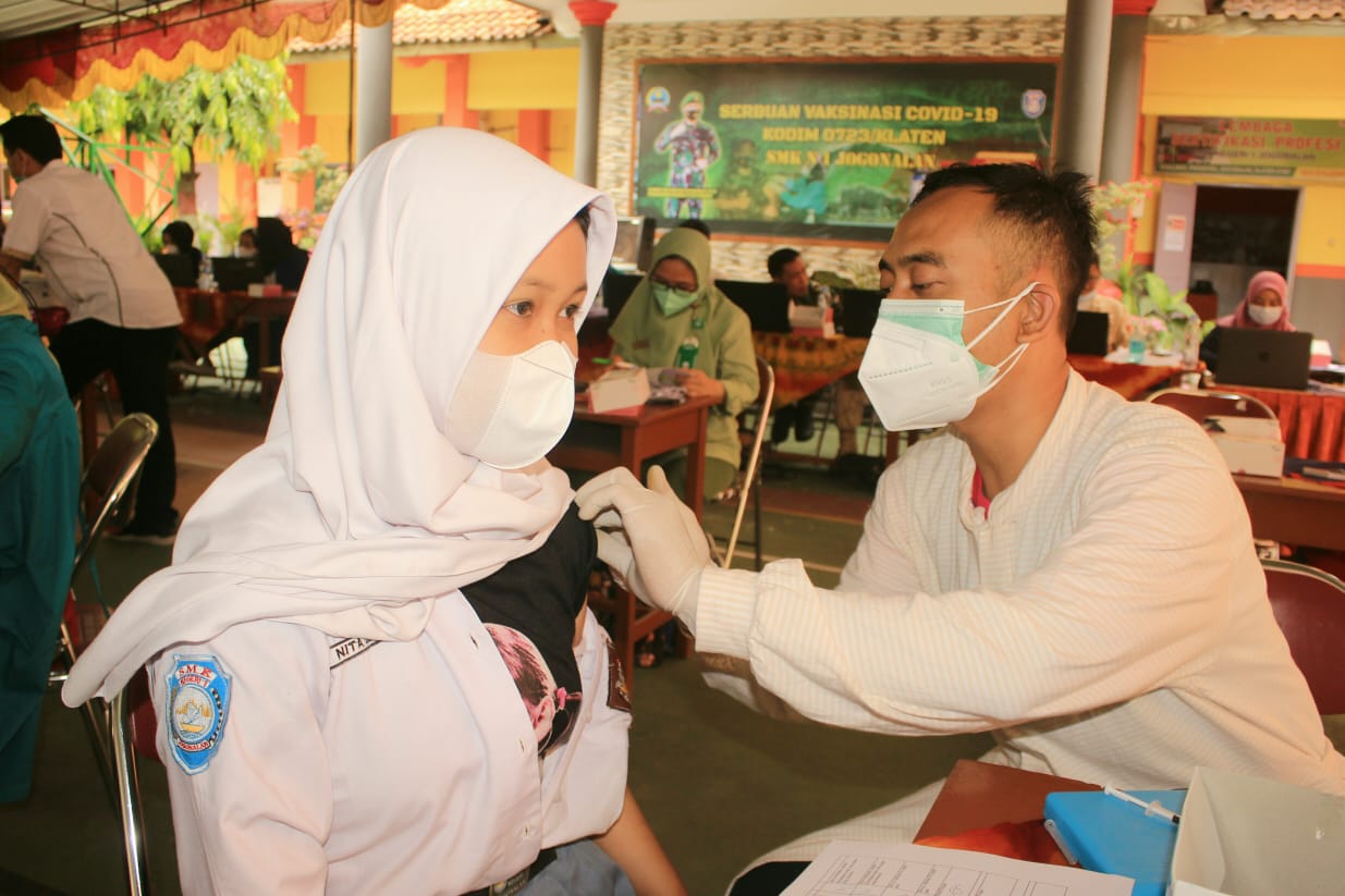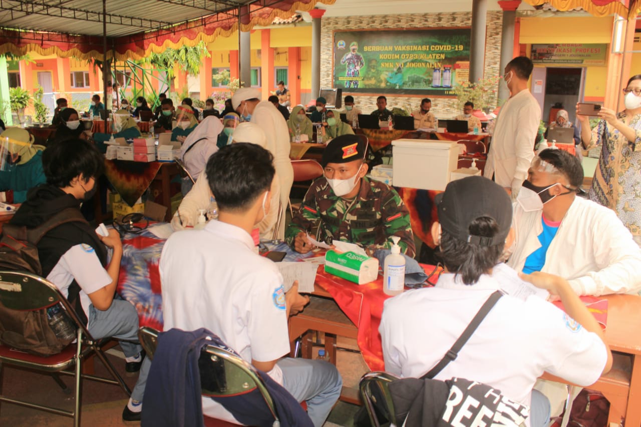 Menurut Mayor Inf Rahman Tanjung, vaksinasi dosis l dengan sasaran siswa SMK Negeri 1 Jogonalan Kab. Klaten dan Tim Vaksinator yang dikerahkan dari FKTP Klinik Pratama Kartika 23, vaksinator Kodim 0723/Klaten, Vaksinator dari RSU Islam Kec. Cawas, Vaksinator dari PKU kec. Jatinom dan Vaksinator dari Klinik PKU Muhammadiyah Kec. Polanharjo serta Vaksinator dari RSJD Soedjarwadi Klaten Selatan.