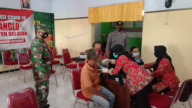 Klaten | Bintara Pembina Desa (Babinsa) Kodim 0723/Klaten Serda Susilo Wahyu Purnomo bersama Bhabinkamtibmas Desa Karanglo Aipda Purwanto dan Kepala Desa Karanglo Khosmas beserta perangkat desa mendampingi petugas Puskesmas Klaten Selatan yang melaksanakan kegiatan Vaksinasi Covid-19 Tahap I bagi warga desa Karanglo Kecamatan Klaten Selatan, Kabupaten Klaten, Sabtu (02/10/2021).
